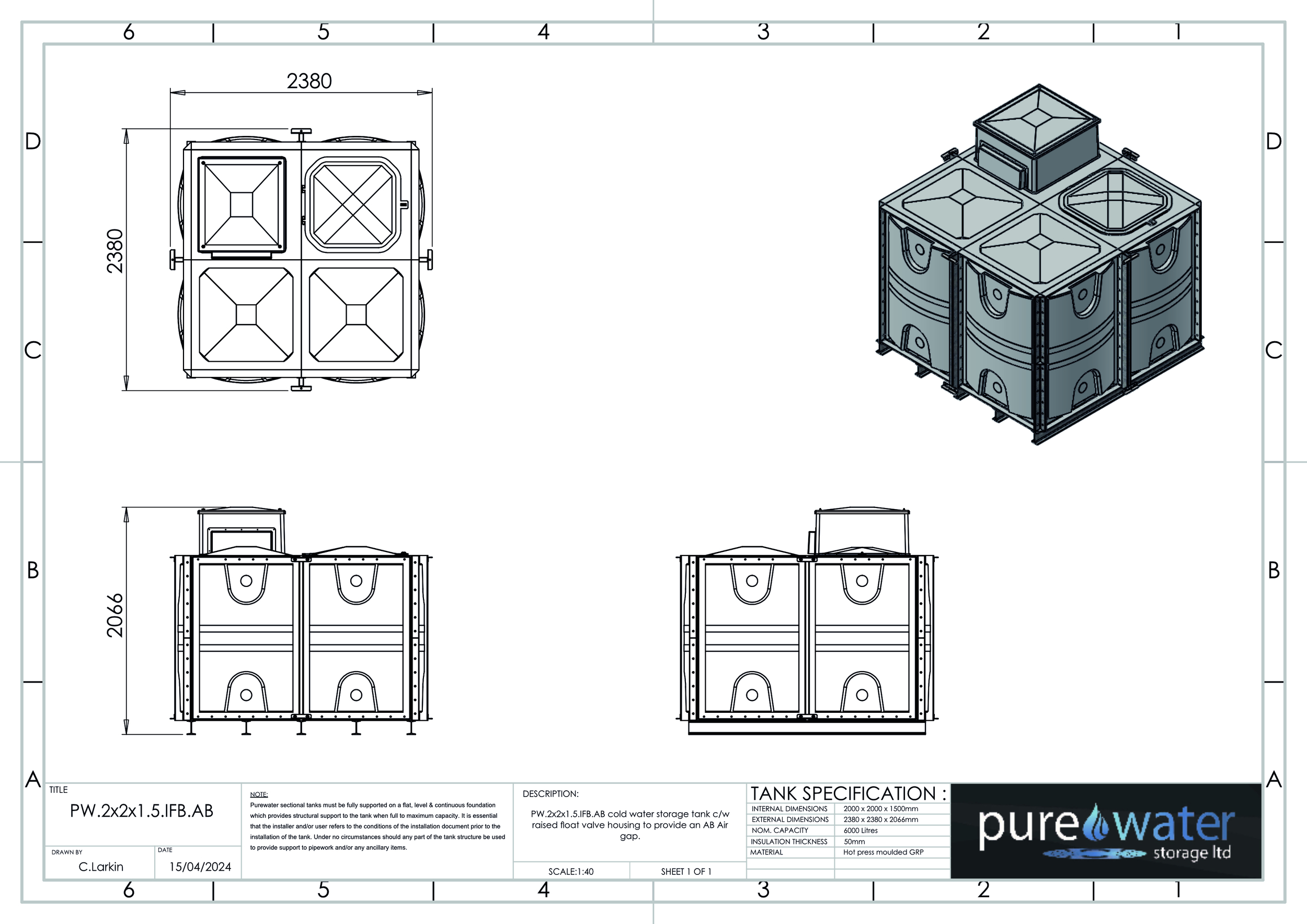6000 Litre Nominal capacity GRP Sectional Water Tank, a sectional tank with an internally flanged base and externally flanged sides. Modular construction utilising bolt together panels suitable for on-site assembly.