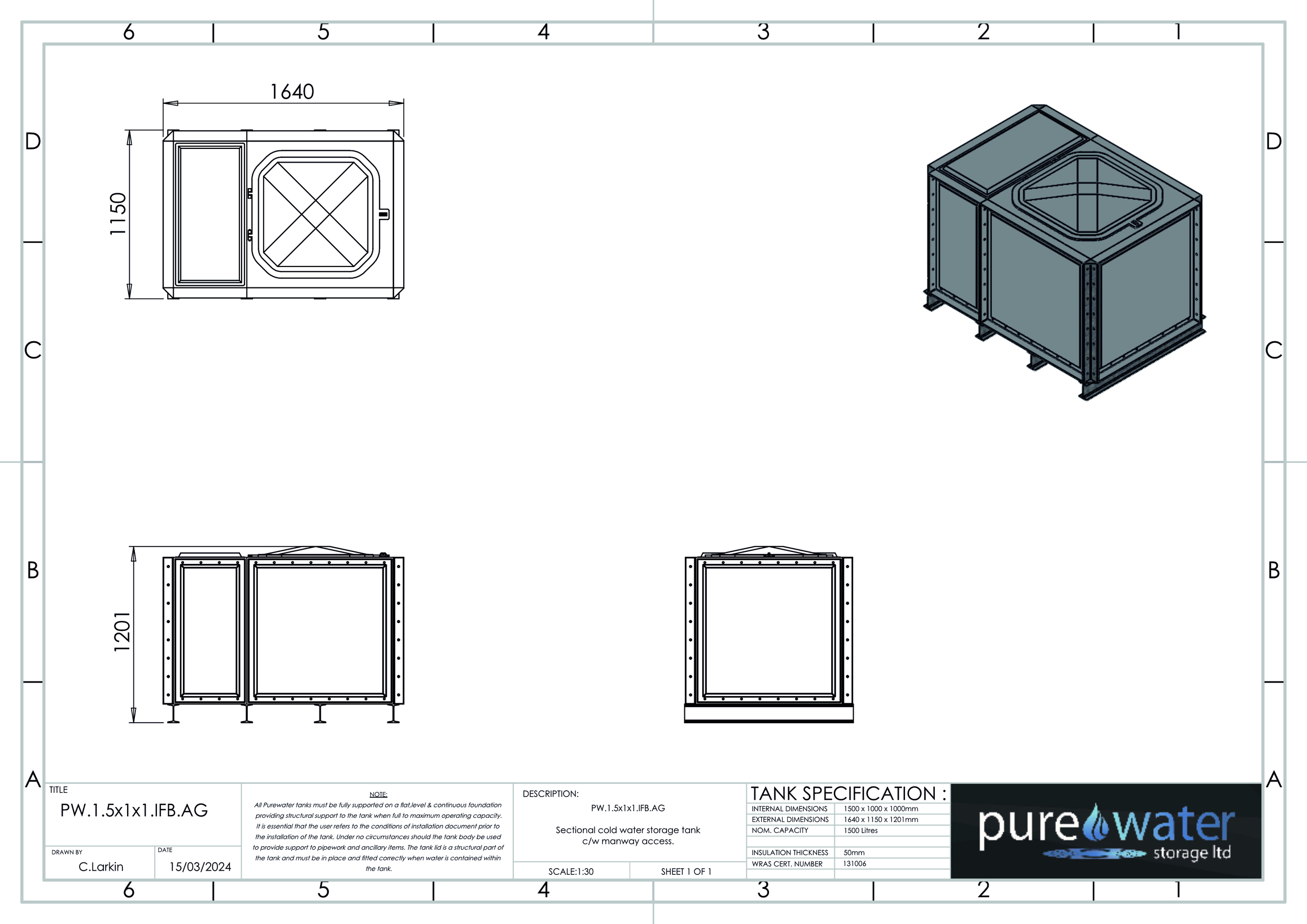 1500 Litre Nominal capacity GRP Sectional Water Tank, a sectional tank with an internally flanged base and externally flanged sides. Modular construction utilising bolt together panels suitable for on-site assembly.