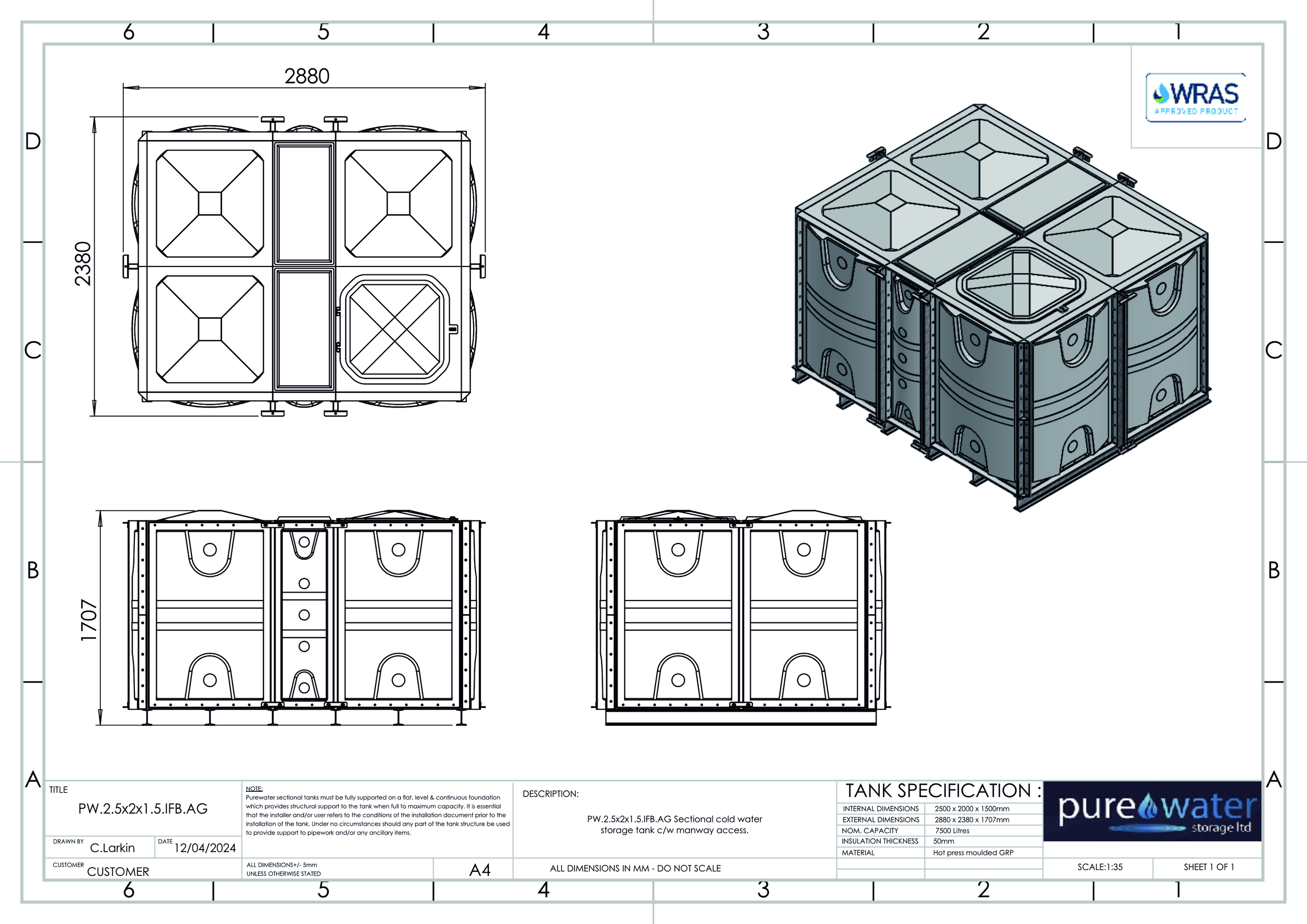 7500 Litre Nominal capacity GRP Sectional Water Tank, a sectional tank with an internally flanged base and externally flanged sides. Modular construction utilising bolt together panels suitable for on-site assembly.