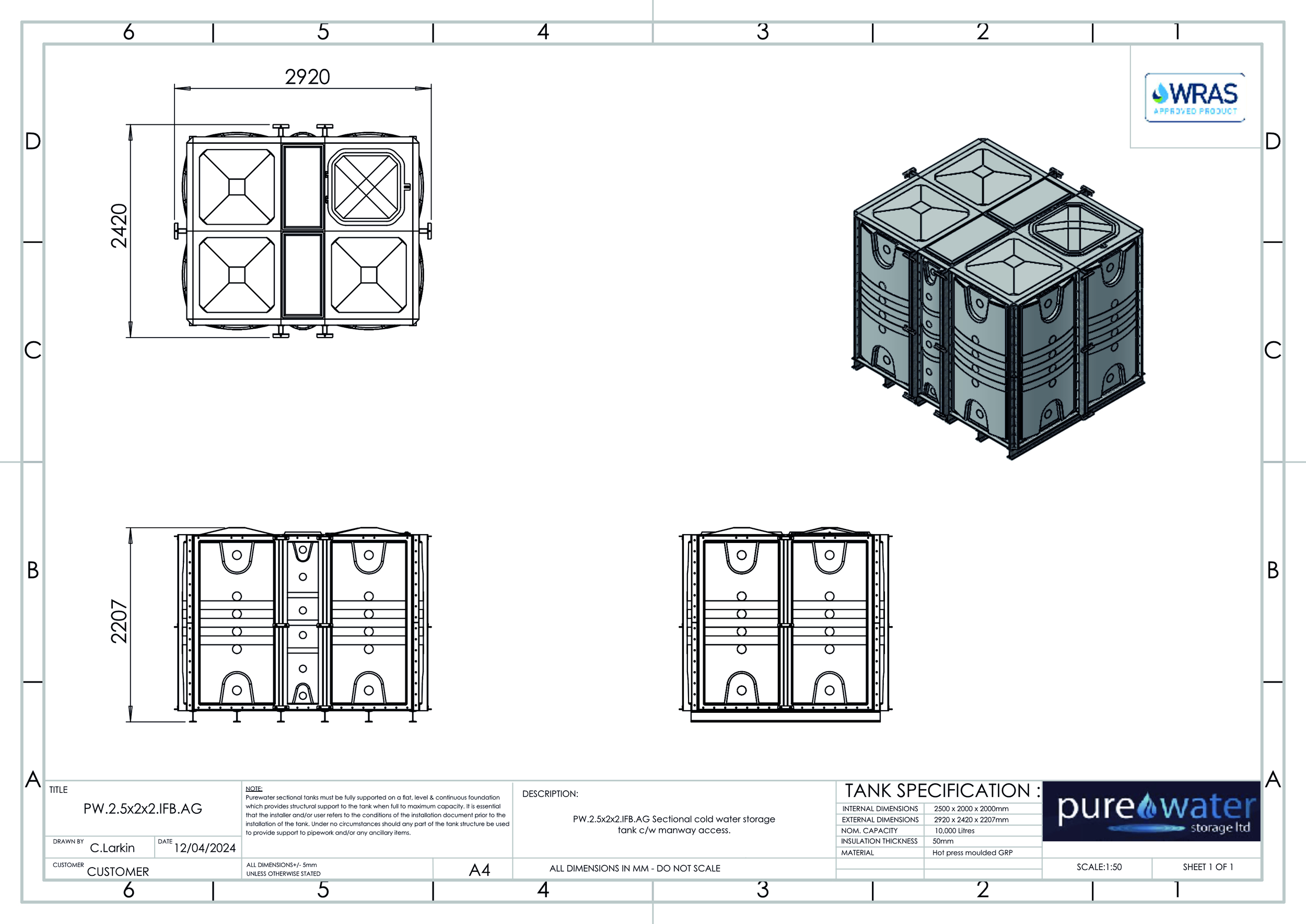 10000 Litre Nominal capacity GRP Sectional Water Tank, a sectional tank with an internally flanged base and externally flanged sides. Modular construction utilising bolt together panels suitable for on-site assembly.Insulated or None insulated available , Kiwa REG4 & WRAS approved for use with potable water. Suitable for a variety of applications including process cooling, rainwater harvesting and many other systems and processes where containment of water is necessary. All gaskets, seals and fixings for assembly are included. Available for self-assembly, or on site assembly is available by fully trained engineers for an additional cost.