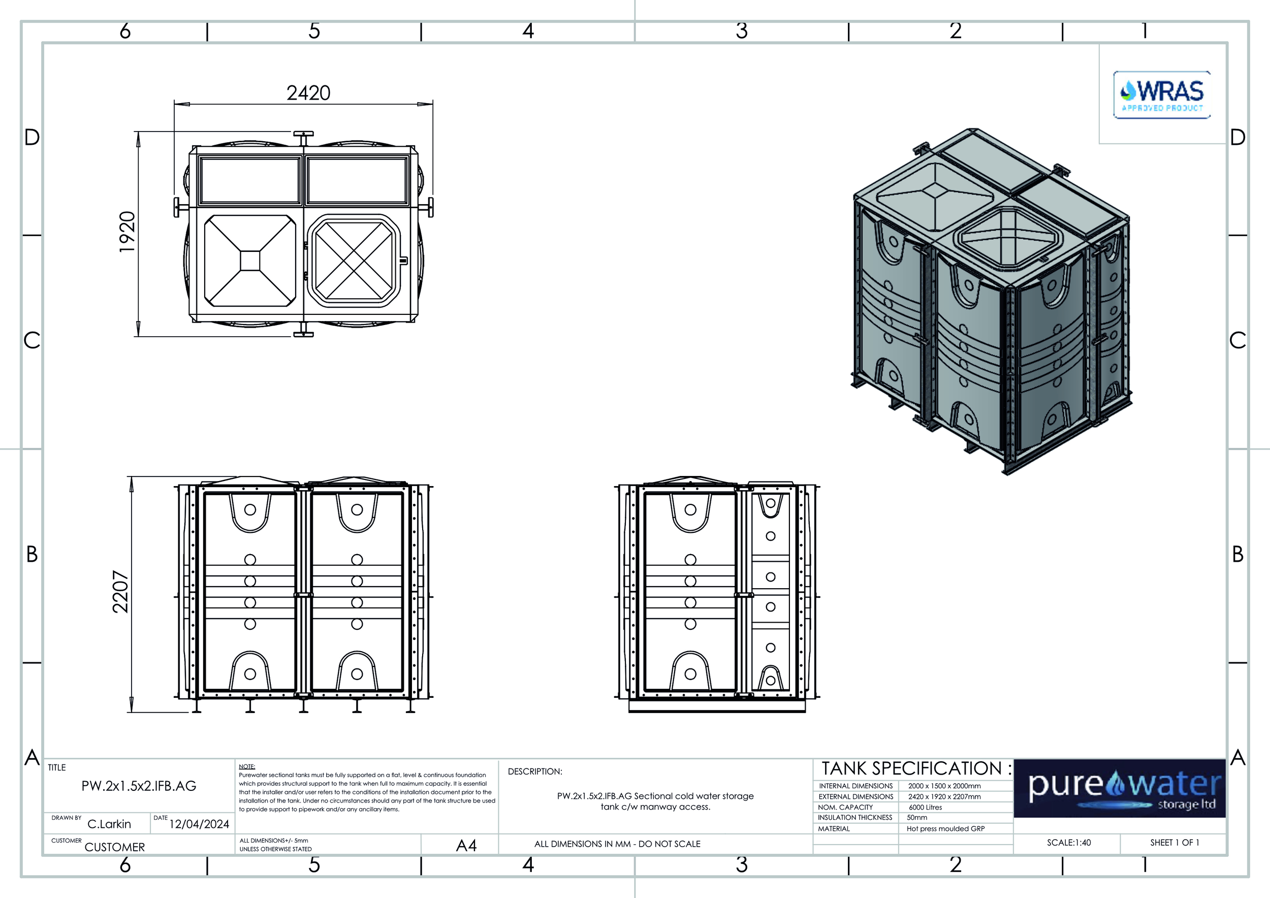 6000 Litre Nominal capacity GRP Sectional Water Tank, a sectional tank with an internally flanged base and externally flanged sides. Modular construction utilising bolt together panels suitable for on-site assembly. Insulated or None insulated available , Kiwa REG4 & WRAS approved for use with potable water. Suitable for a variety of applications including process cooling, rainwater harvesting and many other systems and processes where containment of water is necessary. All gaskets, seals and fixings for assembly are included. Available for self-assembly, or on site assembly is available by fully trained engineers for an additional cost.