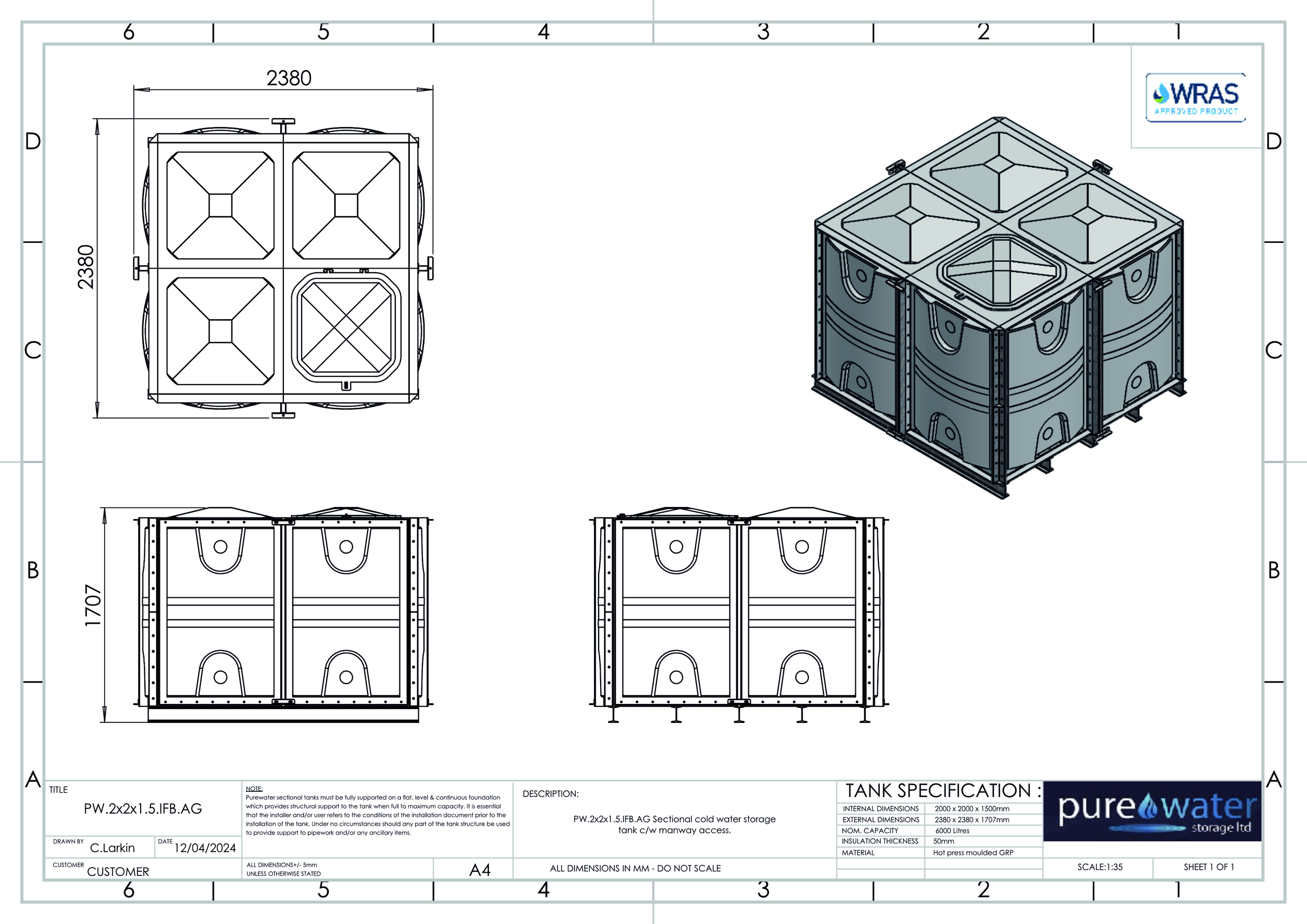 6000 Litre Nominal capacity GRP Sectional Water Tank, a sectional tank with an internally flanged base and externally flanged sides. Modular construction utilising bolt together panels suitable for on-site assembly.