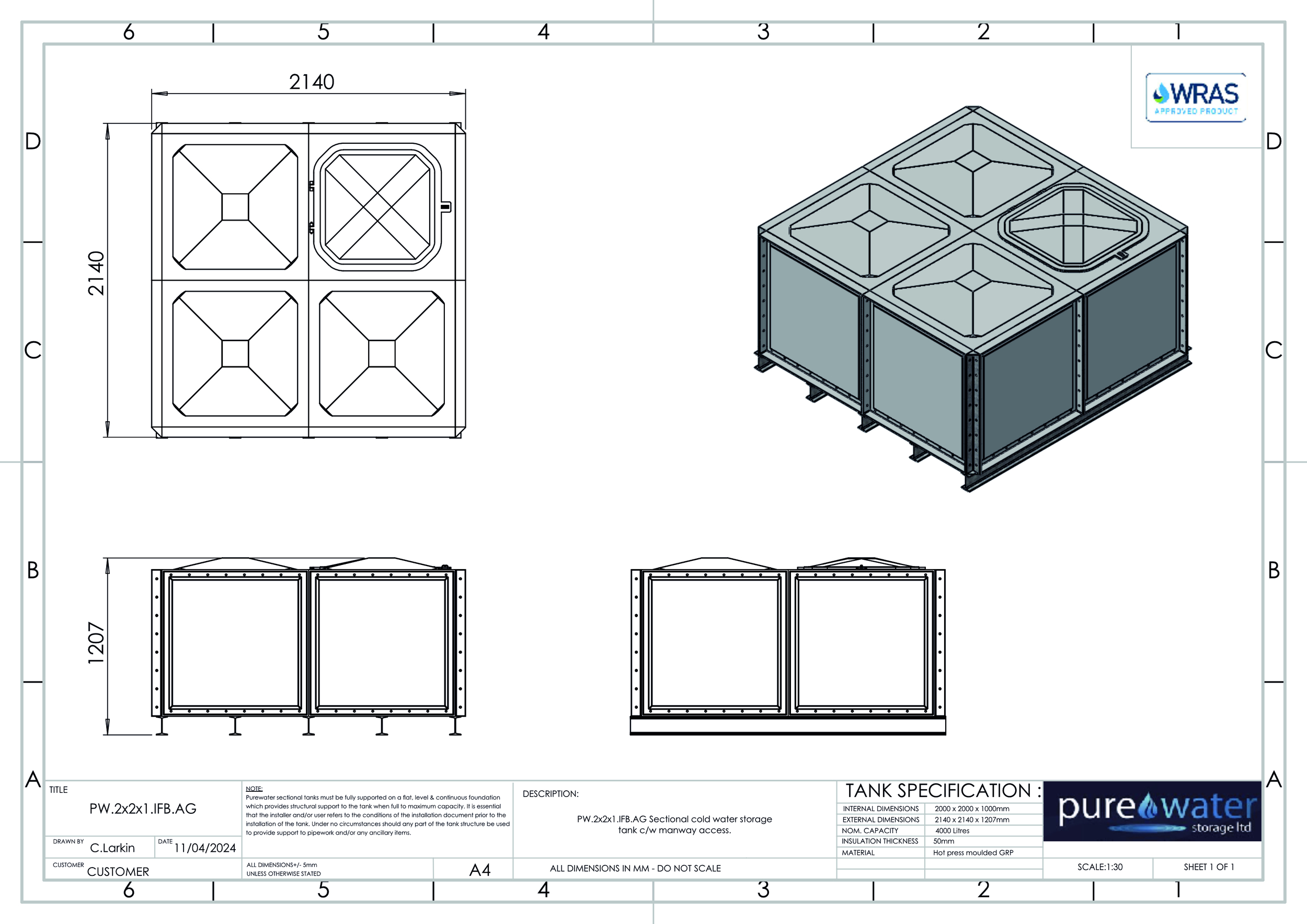 4000 Litre Nominal capacity GRP Sectional Water Tank, a sectional tank with an internally flanged base and externally flanged sides. Modular construction utilising bolt together panels suitable for on-site assembly. Insulated or None insulated available , Kiwa REG4 & WRAS approved for use with potable water. Suitable for a variety of applications including process cooling, rainwater harvesting and many other systems and processes where containment of water is necessary. All gaskets, seals and fixings for assembly are included. Available for self-assembly, or on site assembly is available by fully trained engineers for an additional cost.