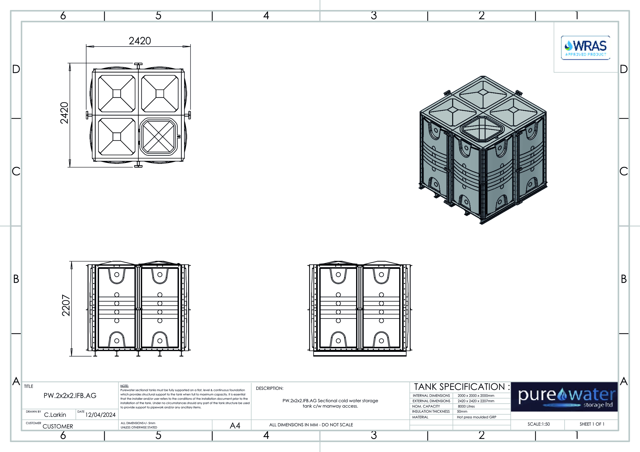 8000 Litre Nominal capacity GRP Sectional Water Tank, a sectional tank with an internally flanged base and externally flanged sides. Modular construction utilising bolt together panels suitable for on-site assembly. Insulated or None insulated available , Kiwa REG4 & WRAS approved for use with potable water. Suitable for a variety of applications including process cooling, rainwater harvesting and many other systems and processes where containment of water is necessary. All gaskets, seals and fixings for assembly are included. Available for self-assembly, or on site assembly is available by fully trained engineers for an additional cost.