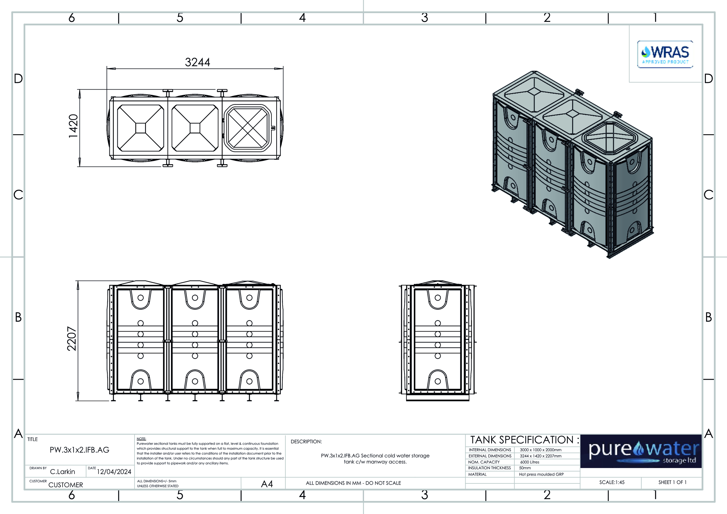 6000 LITRE SECTIONAL WATER TANK, INTERNALLY FLANGED BASE (IFB)