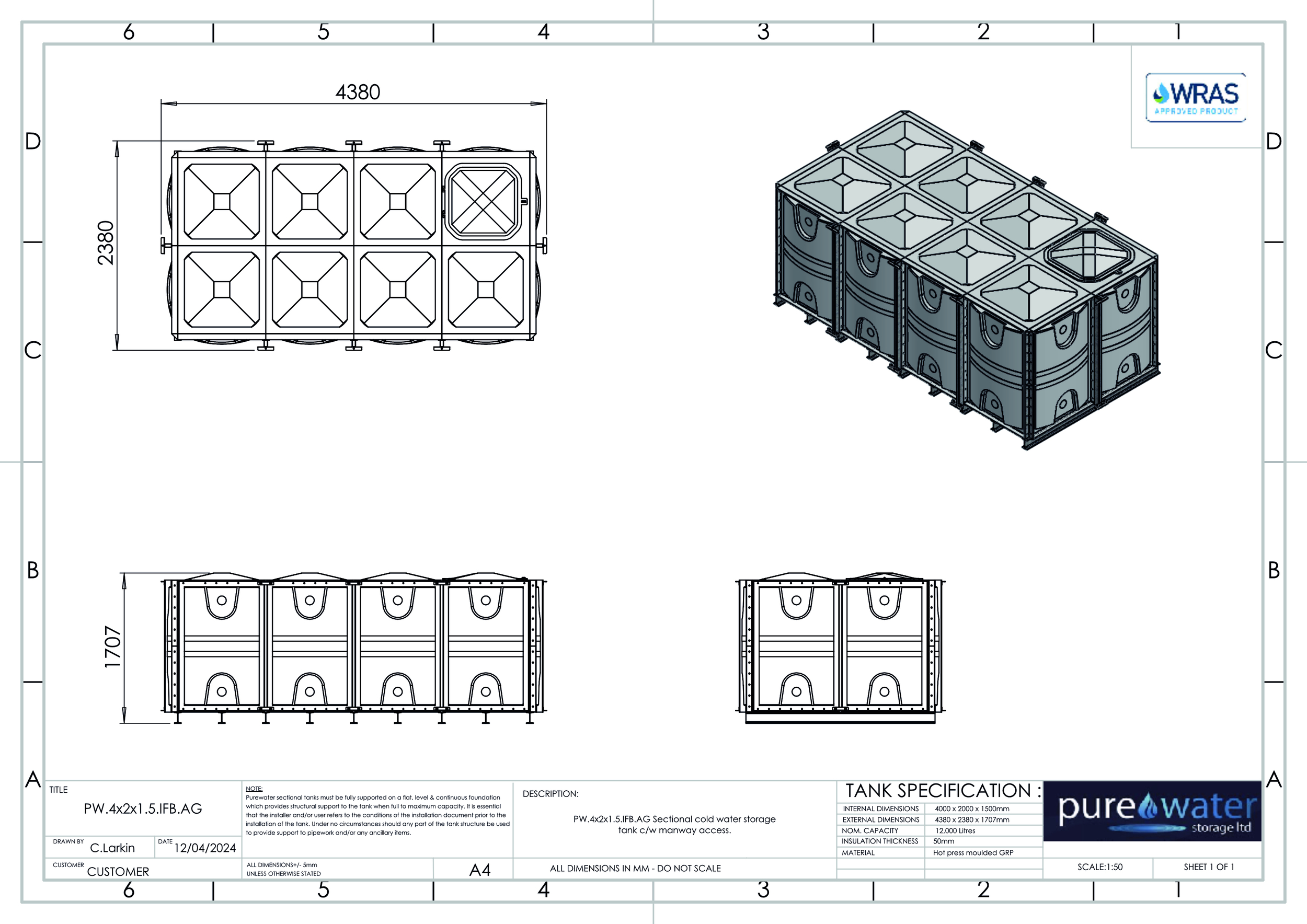 12000 Litre Nominal capacity GRP Sectional Water Tank, a sectional tank with an internally flanged base and externally flanged sides. Modular construction utilising bolt together panels suitable for on-site assembly.