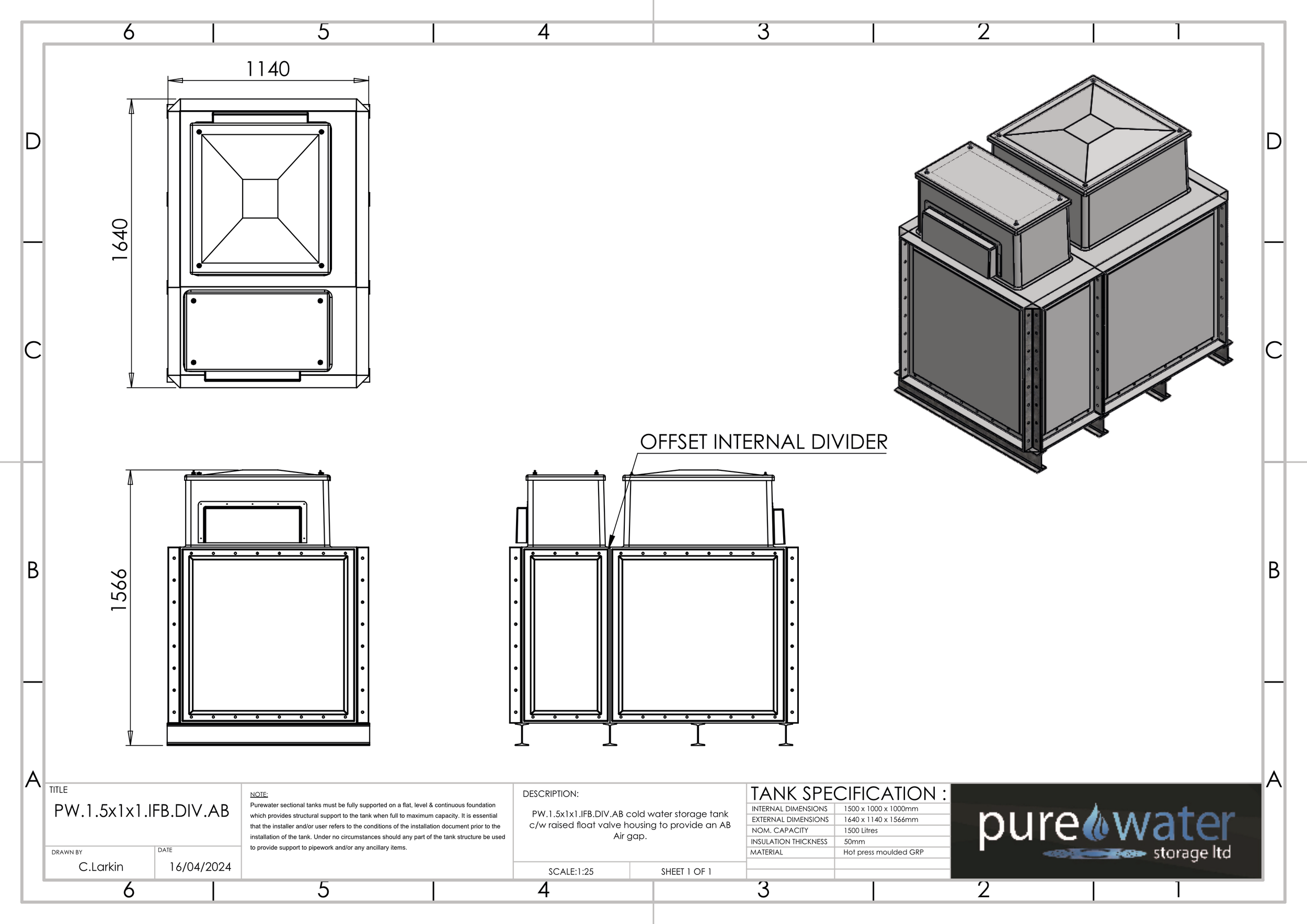 1500 LITRE DIVIDED SECTIONAL WATER TANK, INTERNALLY FLANGED BASE (IFB)