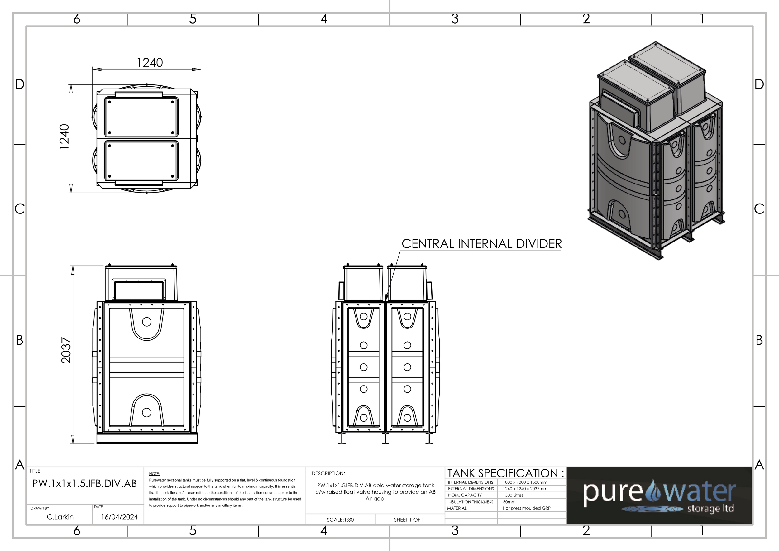 1500 LITRE DIVIDED SECTIONAL WATER TANK, INTERNALLY FLANGED BASE (IFB)