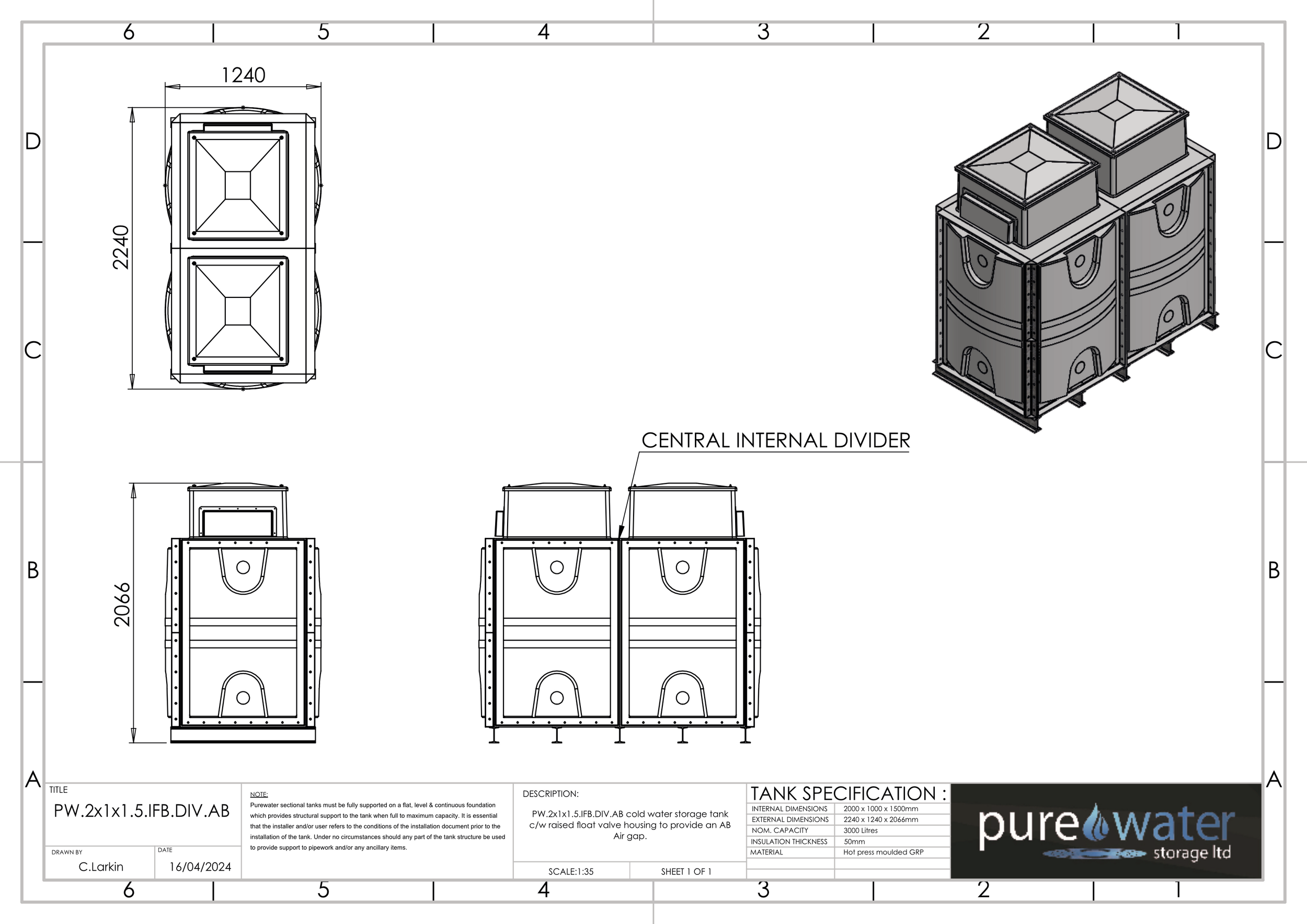 3000 LITRE DIVIDED SECTIONAL WATER TANK, INTERNALLY FLANGED BASE (IFB)