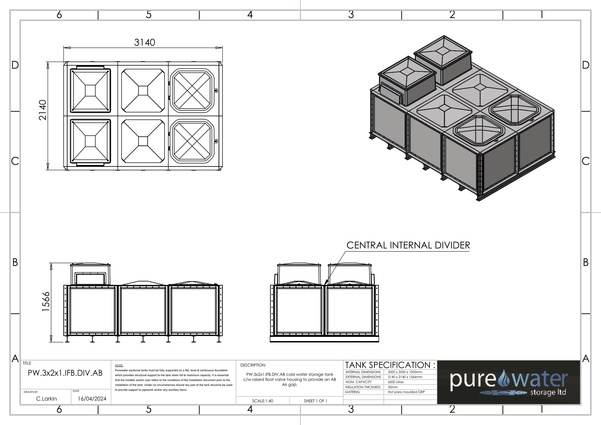 6000 LITRE DIVIDED SECTIONAL WATER TANK, INTERNALLY FLANGED BASE (IFB)