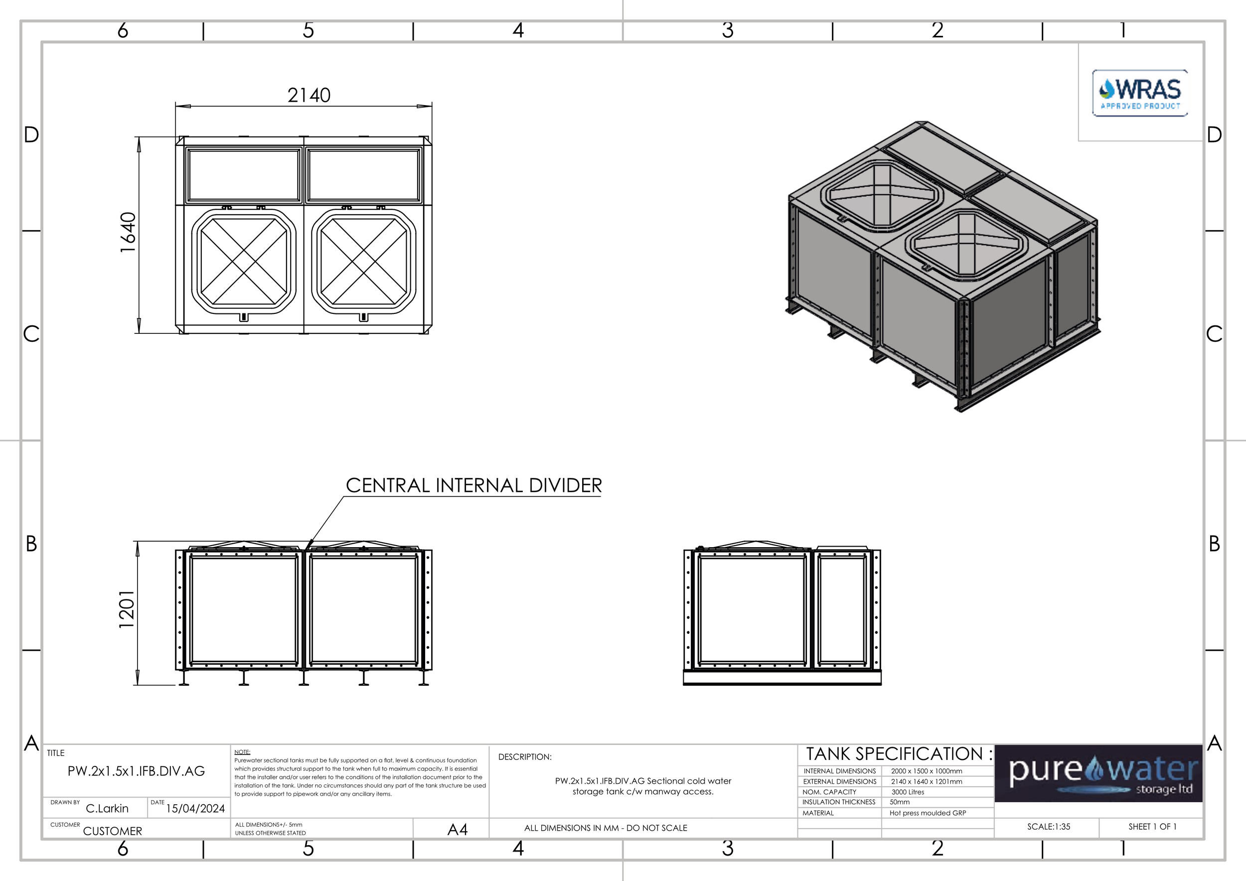 3000 LITRE DIVIDED SECTIONAL WATER TANK, INTERNALLY FLANGED BASE (IFB)