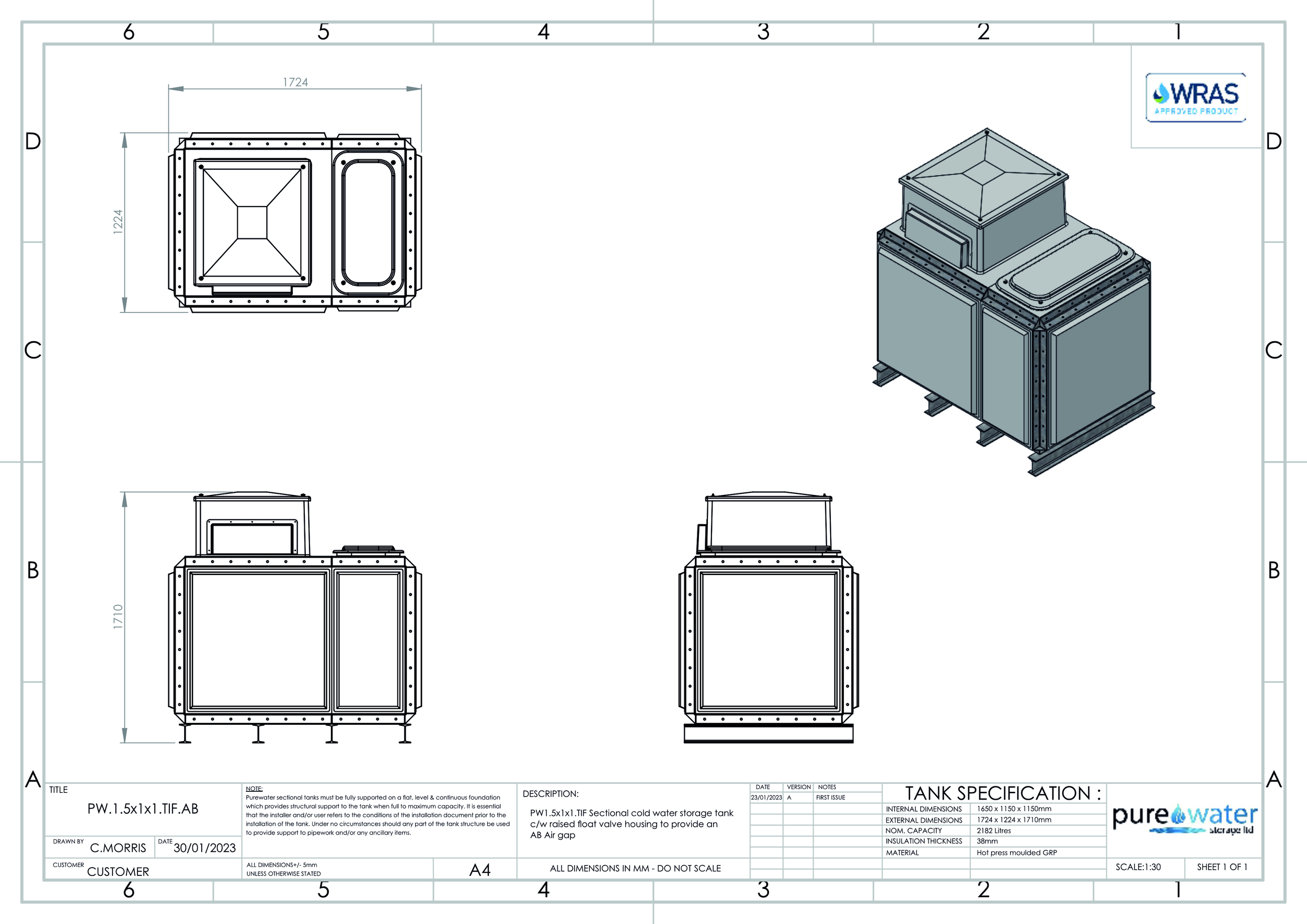 2182 Litre Nominal capacity GRP Sectional Water Tank, a sectional tank with an internally flanged base and internally flanged sides.