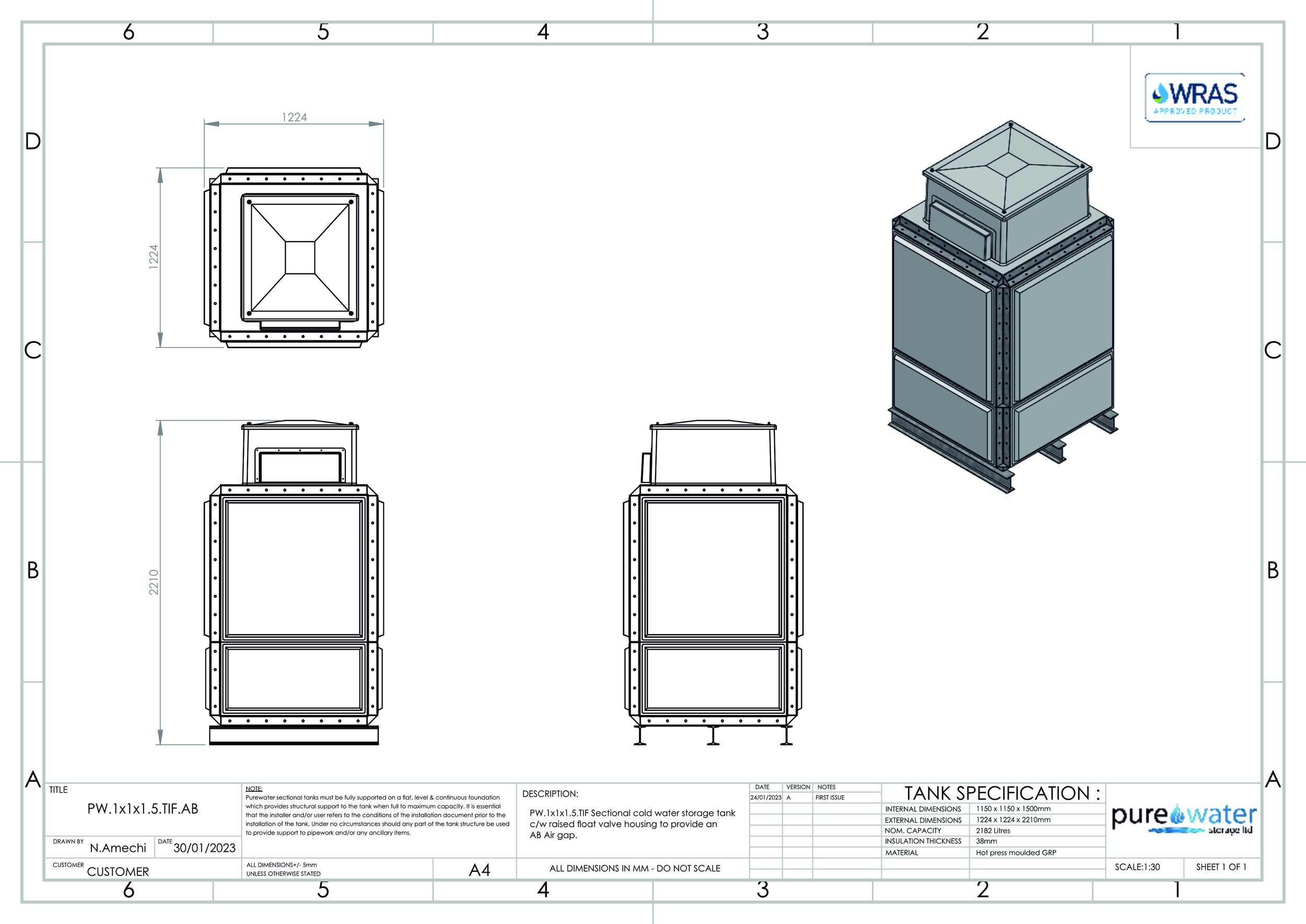 2182 Litre Nominal capacity GRP Sectional Water Tank, a sectional tank with an internally flanged base and internally flanged sides.