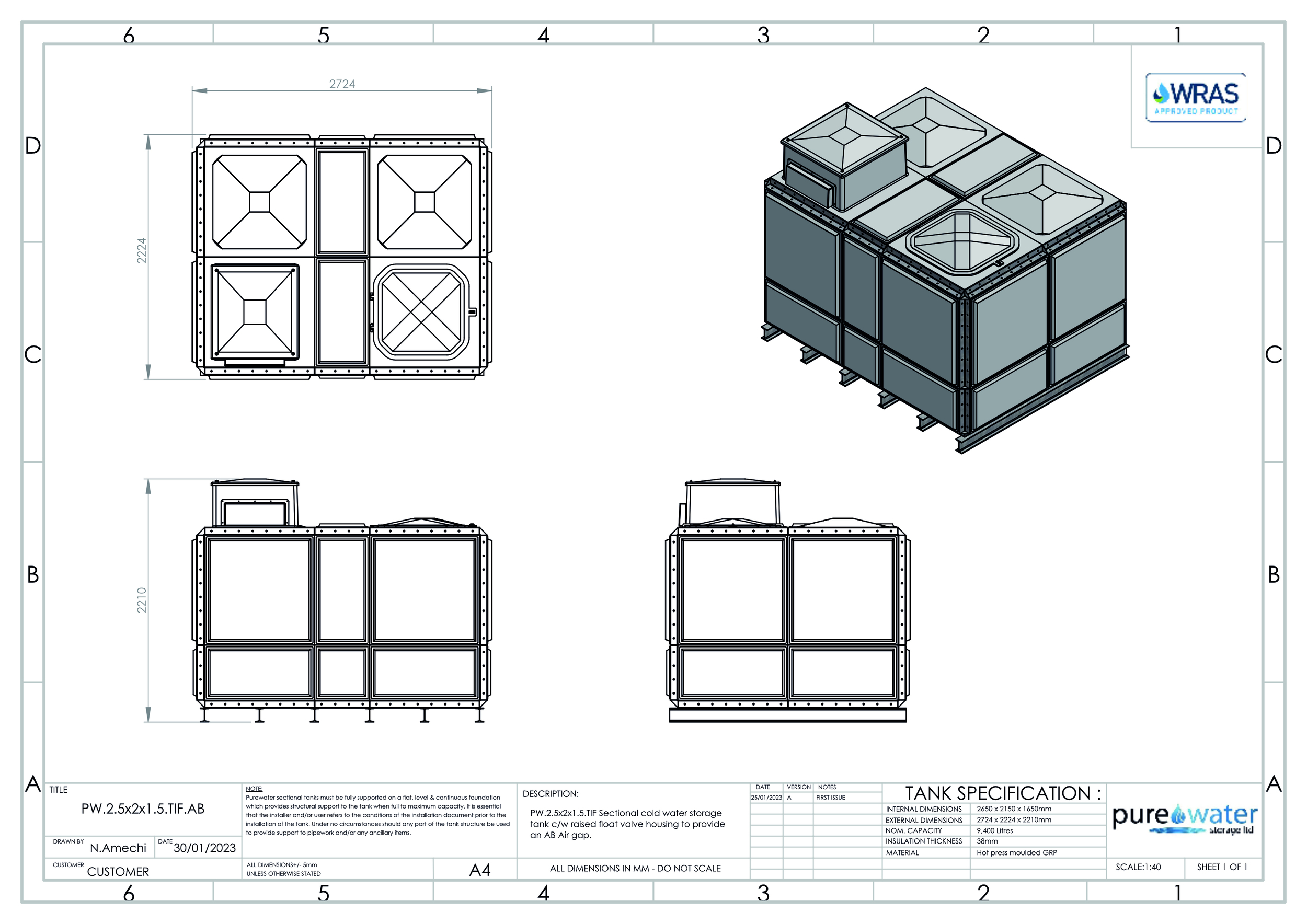 9400 Litre Nominal capacity GRP Sectional Water Tank, a sectional tank with an internally flanged base and internally flanged sides.