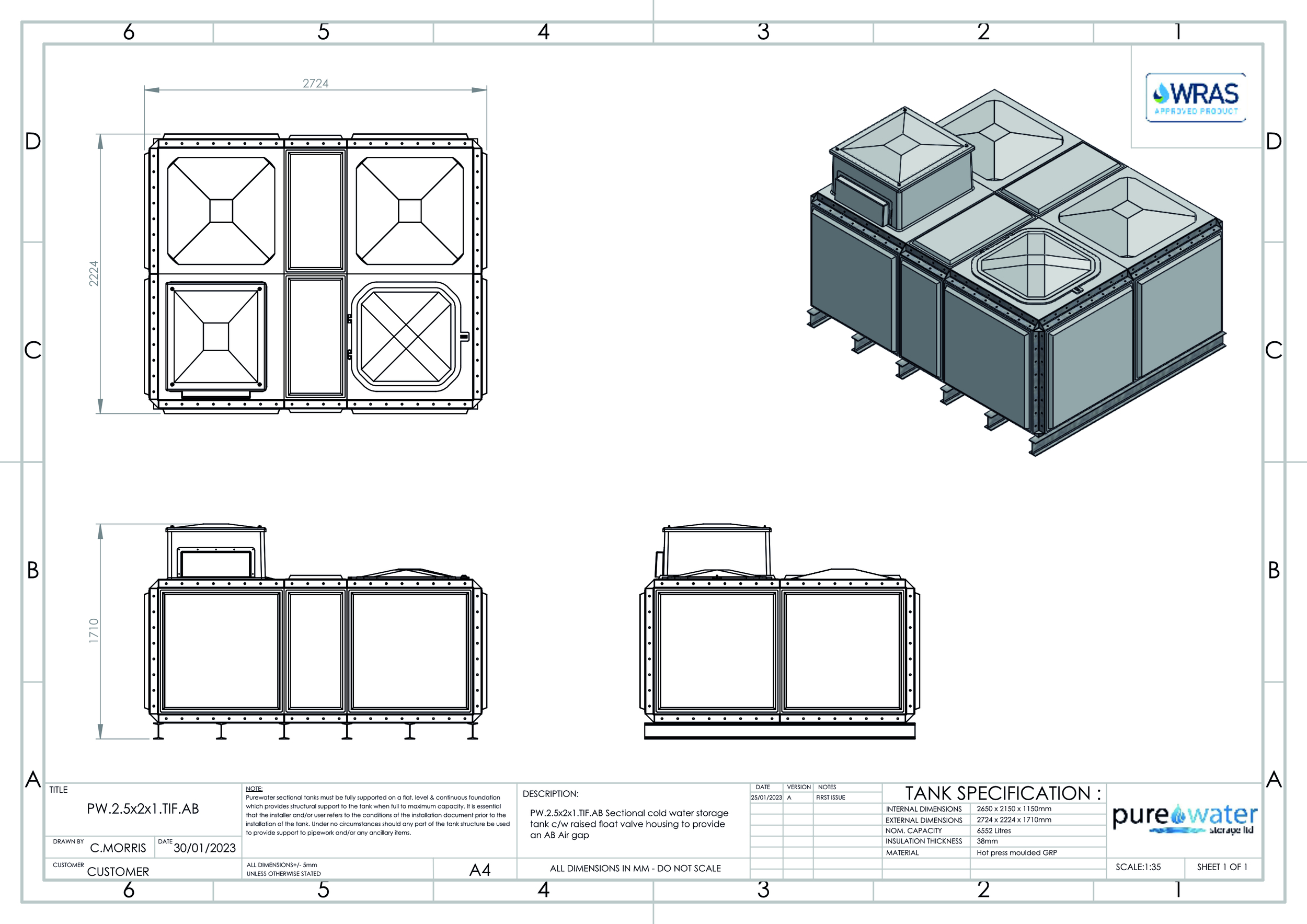 6552 Litre Nominal capacity GRP Sectional Water Tank, a sectional tank with an internally flanged base and internally flanged sides.