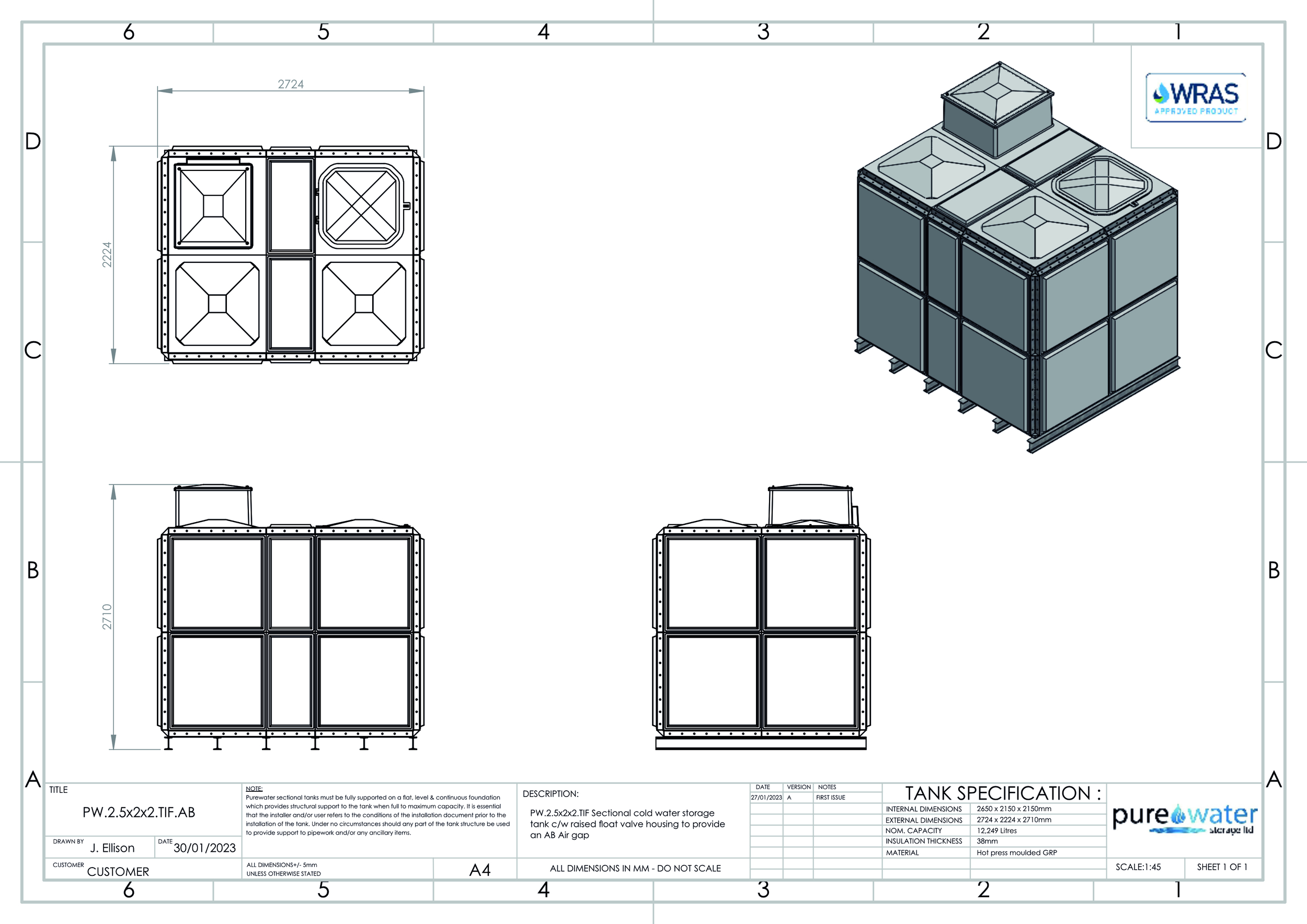 12,249 Litre Nominal capacity GRP Sectional Water Tank, a sectional tank with an internally flanged base and internally flanged sides.