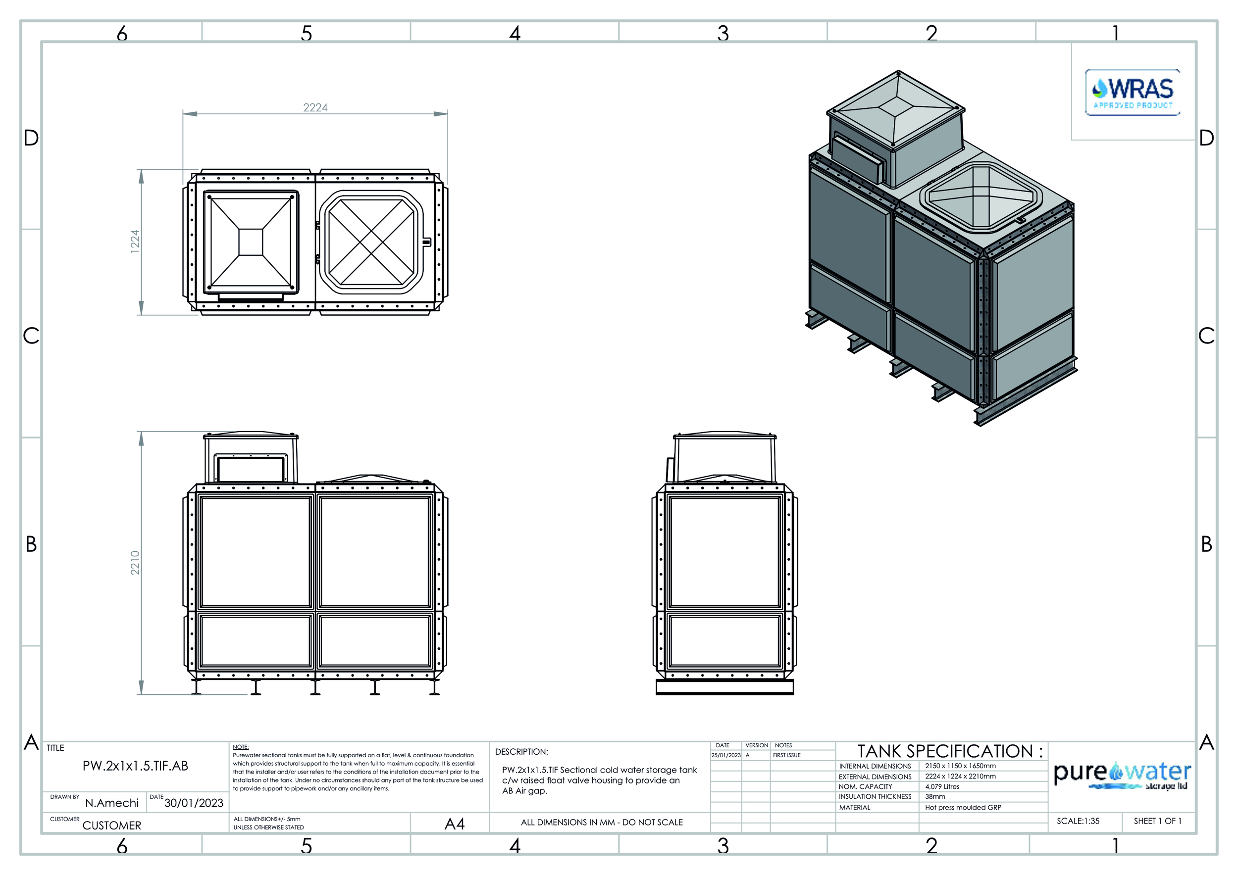 4079 Litre Nominal capacity GRP Sectional Water Tank, a sectional tank with an internally flanged base and internally flanged sides.