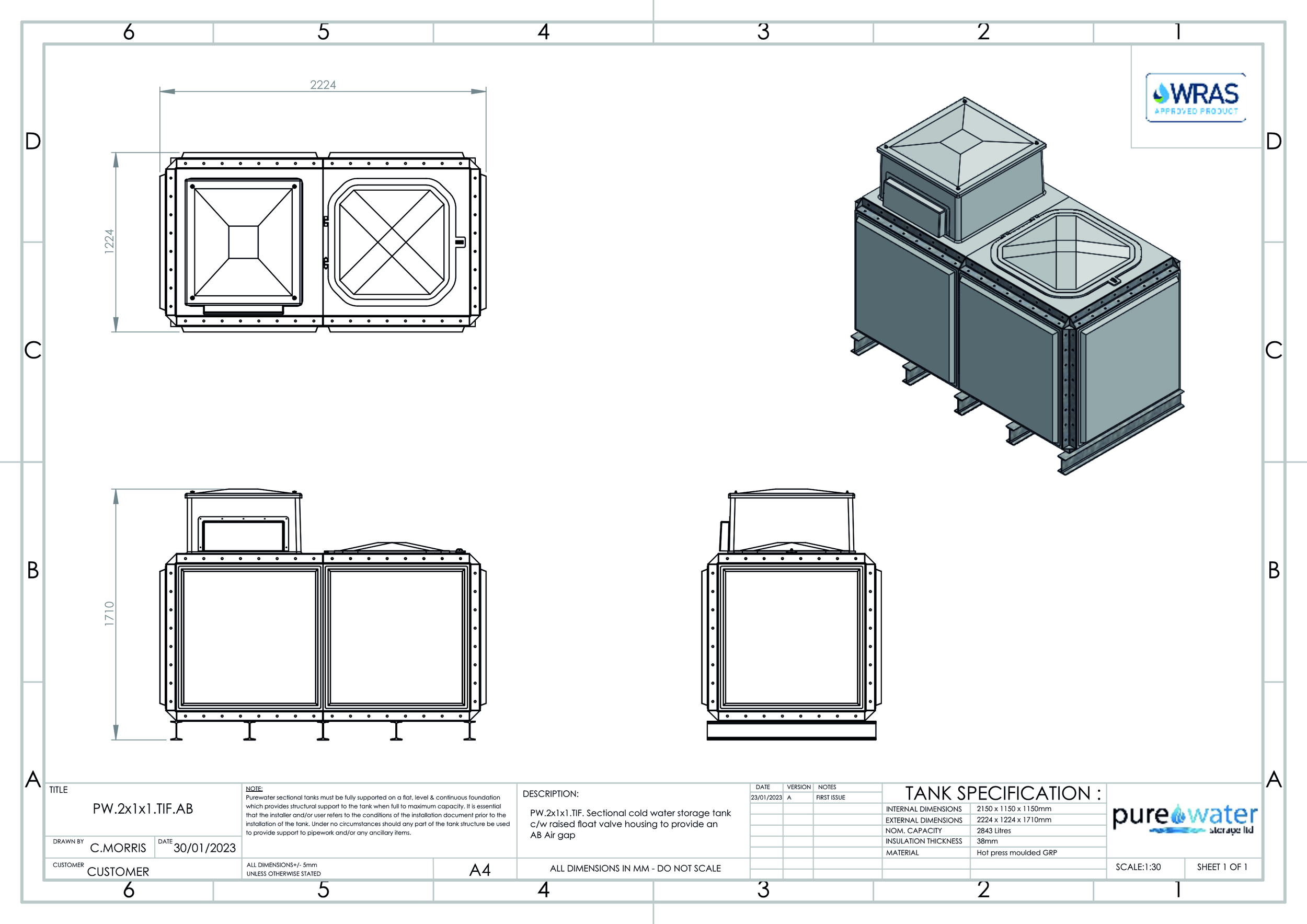 2843 Litre Nominal capacity GRP Sectional Water Tank, a sectional tank with an internally flanged base and internally flanged sides.