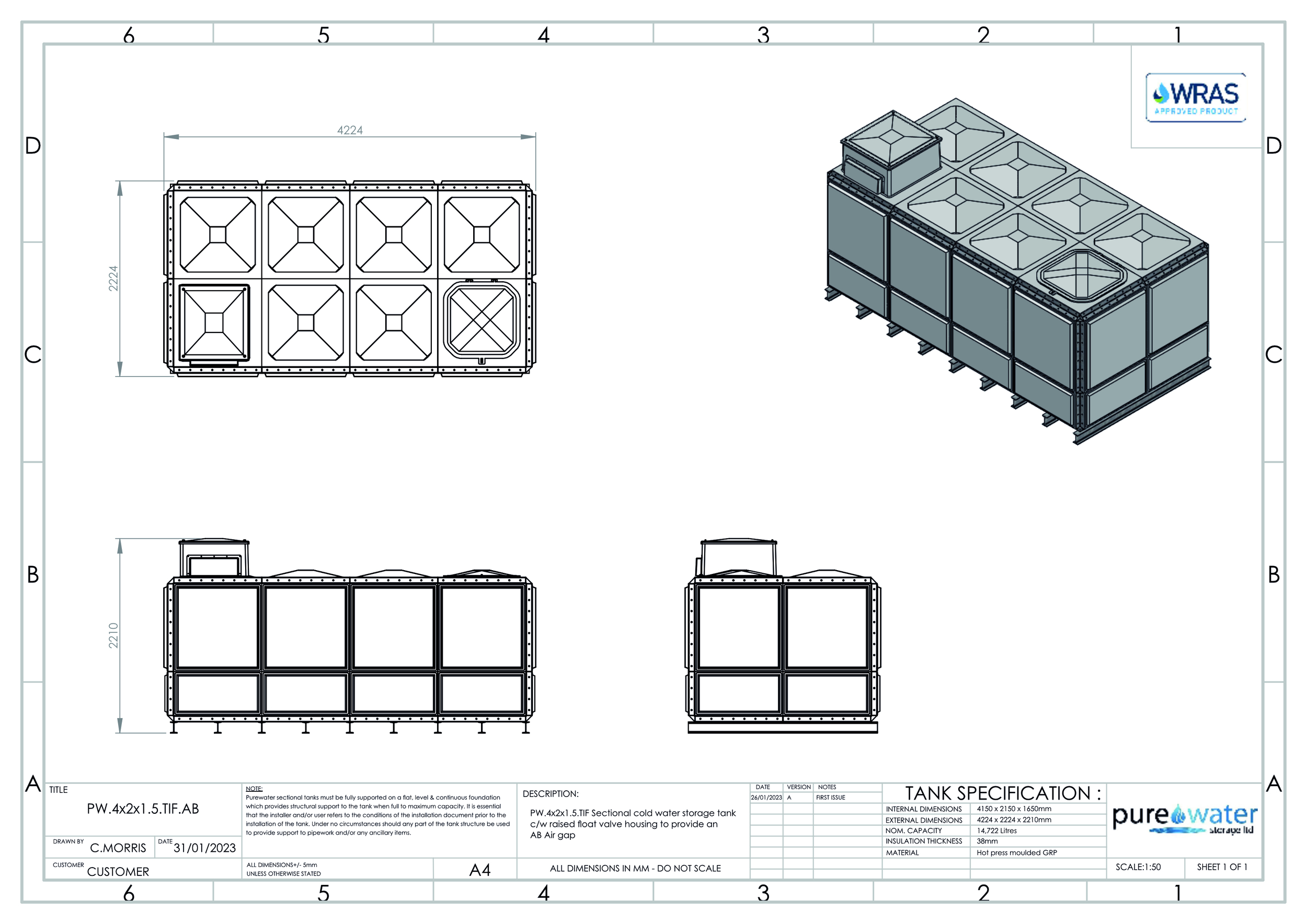 14,722 Litre Nominal capacity GRP Sectional Water Tank, a sectional tank with an internally flanged base and internally flanged sides.