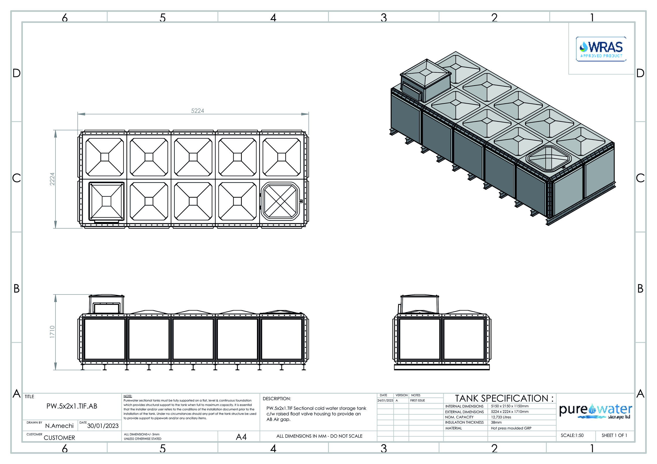 12,733 Litre Nominal capacity GRP Sectional Water Tank, a sectional tank with an internally flanged base and internally flanged sides.