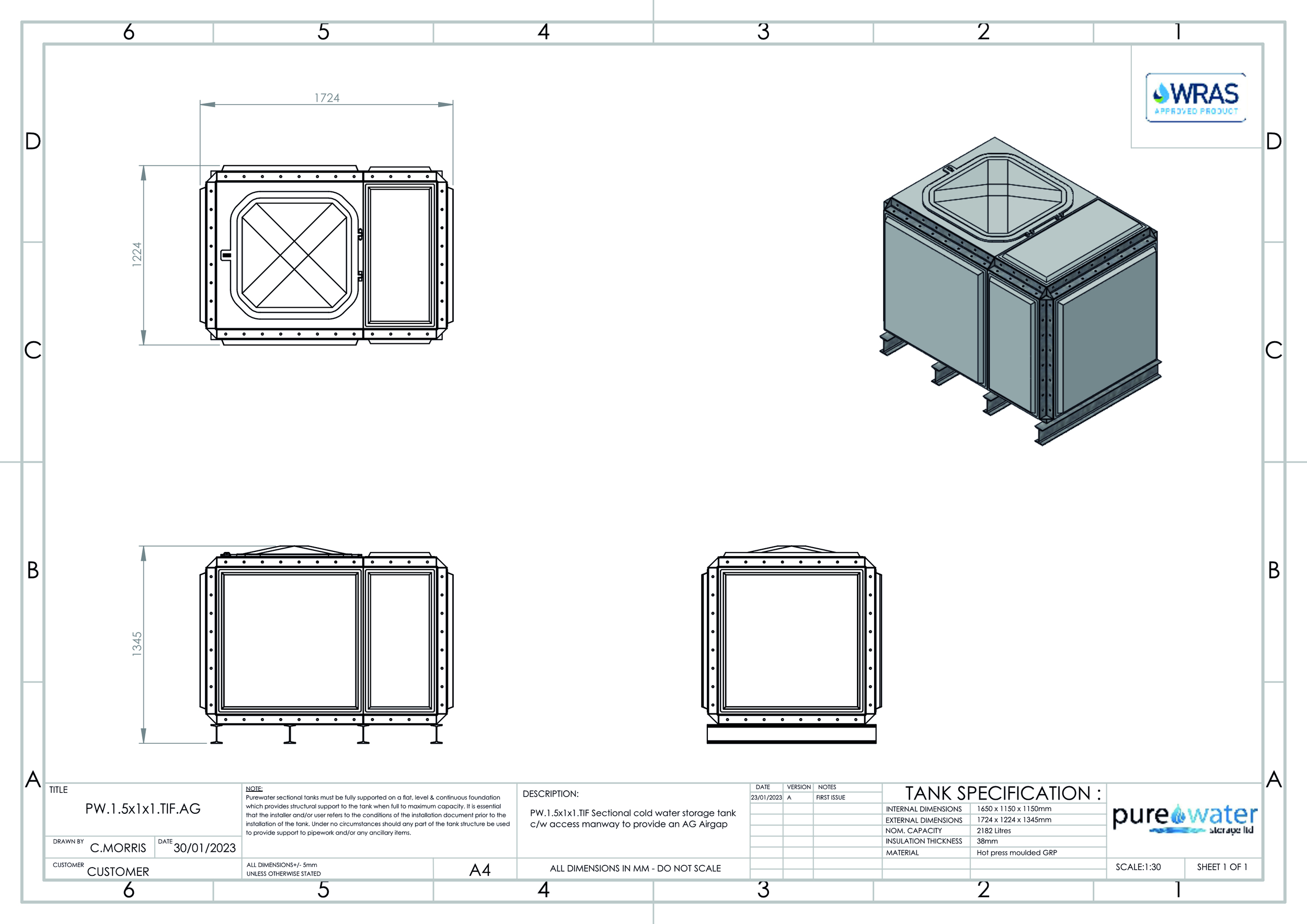 2182 Litre Nominal capacity GRP Sectional Water Tank, a sectional tank with an internally flanged base and internally flanged sides.