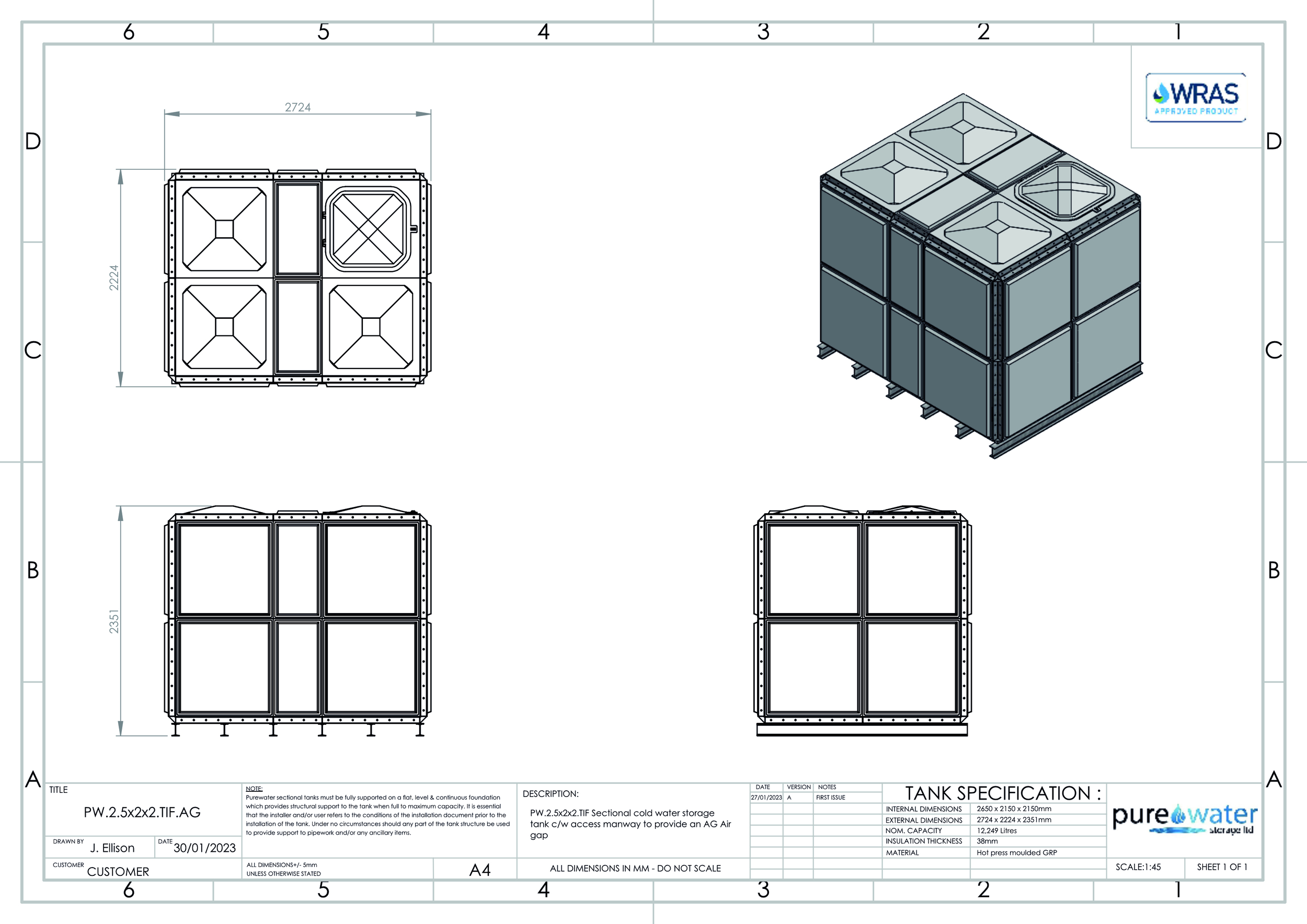 12,249 Litre Nominal capacity GRP Sectional Water Tank, a sectional tank with an internally flanged base and internally flanged sides.
