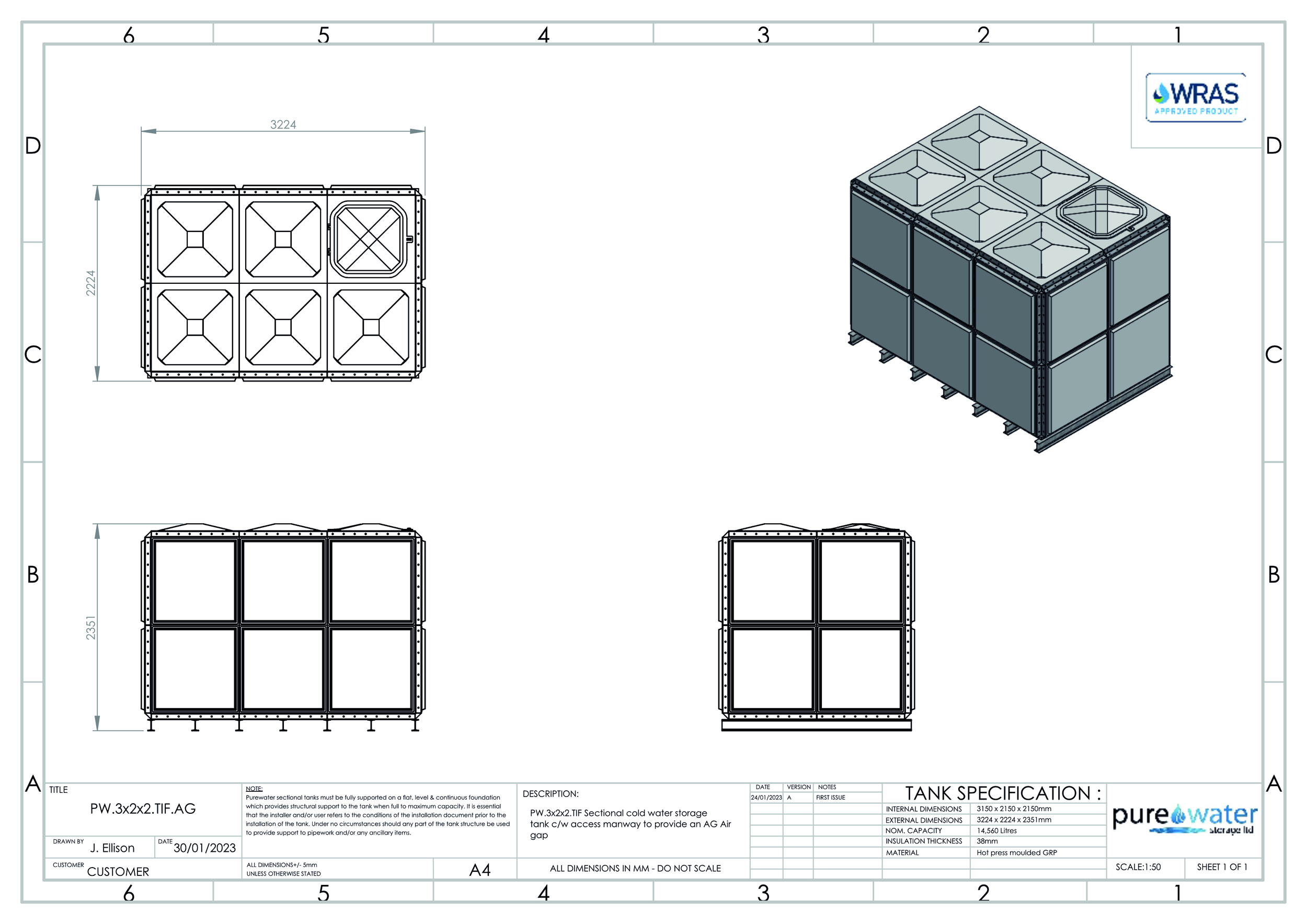14,560 Litre Nominal capacity GRP Sectional Water Tank, a sectional tank with an internally flanged base and internally flanged sides.