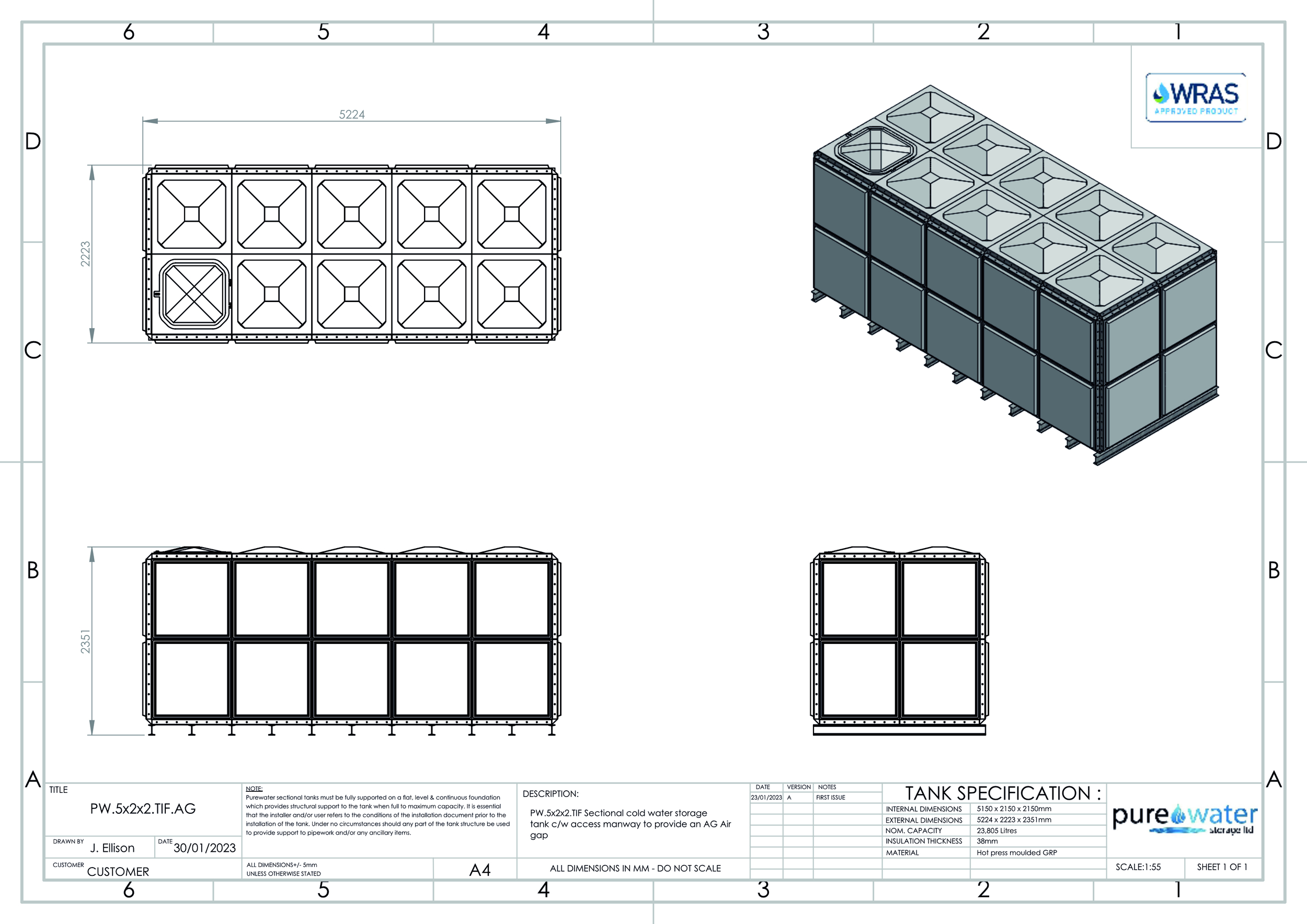7627 Litre Nominal capacity GRP Sectional Water Tank, a sectional tank with an internally flanged base and internally flanged sides.