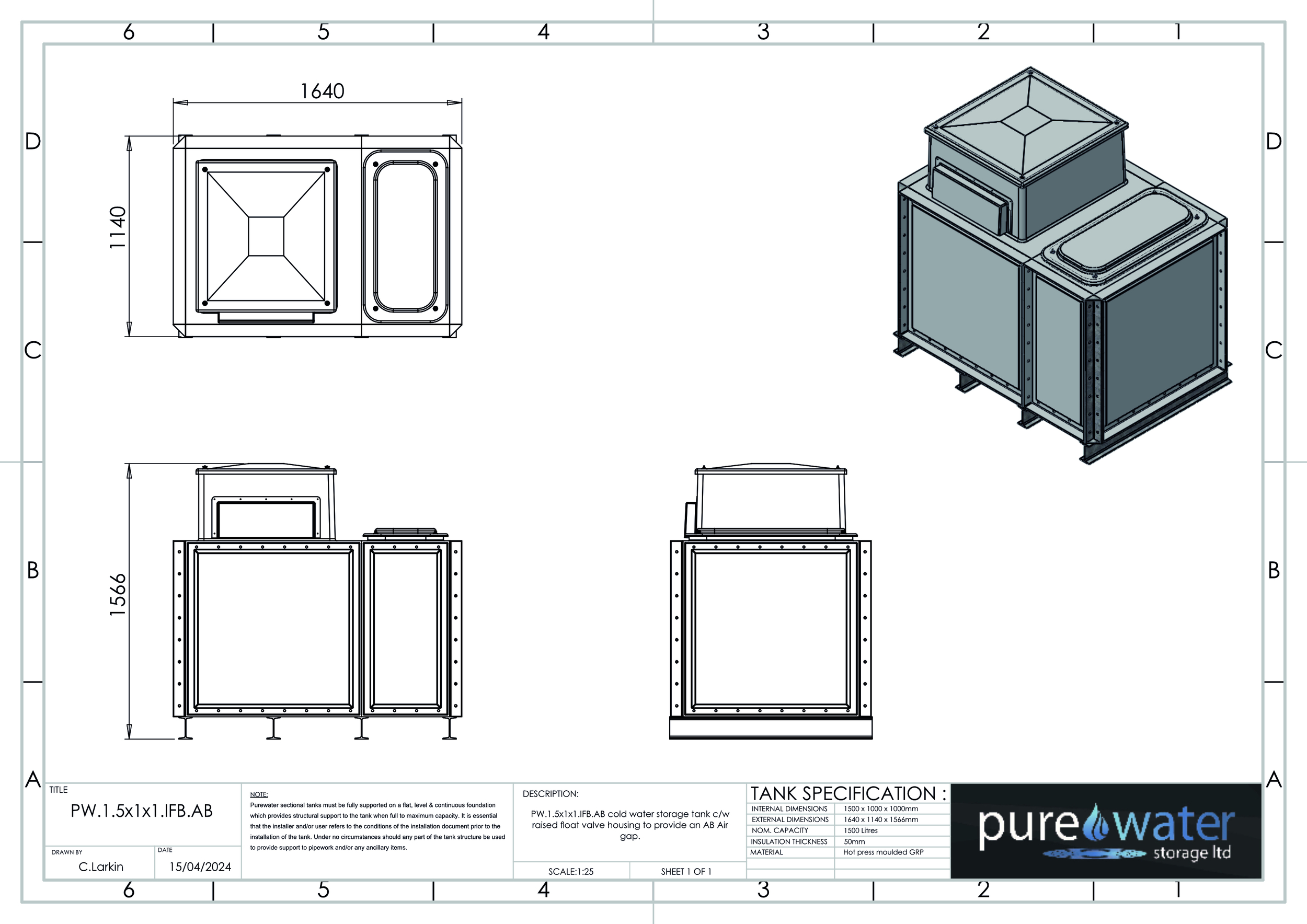 1500 Litre Nominal capacity GRP Sectional Water Tank, a sectional tank with an internally flanged base and externally flanged sides. Modular construction utilising bolt together panels suitable for on-site assembly.